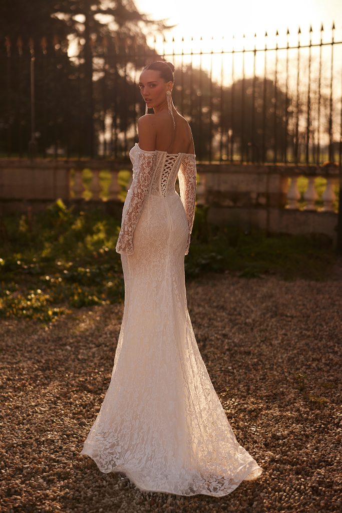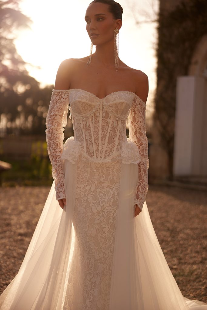 Ein romantisches Meerjungfrauen-Brautkleid aus zarter floraler Spitze, das die Figur elegant umschmeichelt. Das schulterfreie Sweetheart-Korsett und die langen Spitzenärmel verleihen dem Look eine weiche, feminine Ausstrahlung, während die figurbetonte Silhouette die natürlichen Formen betont.