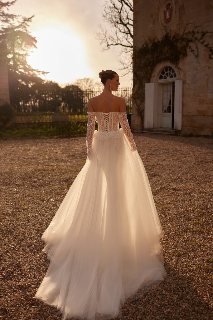 Ein abnehmbarer, luftiger Tüll-Überrock sorgt für zusätzliches Volumen und Bewegung und verwandelt das Kleid für die Zeremonie in einen dramatischeren, ätherischen Brautlook.