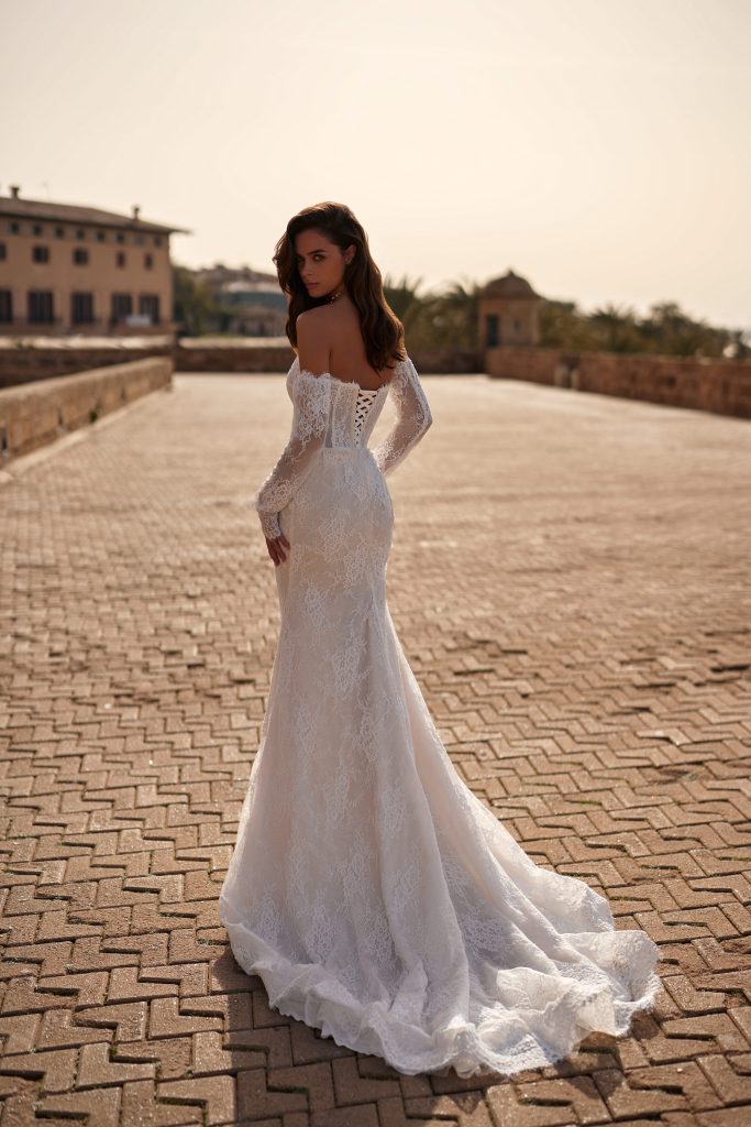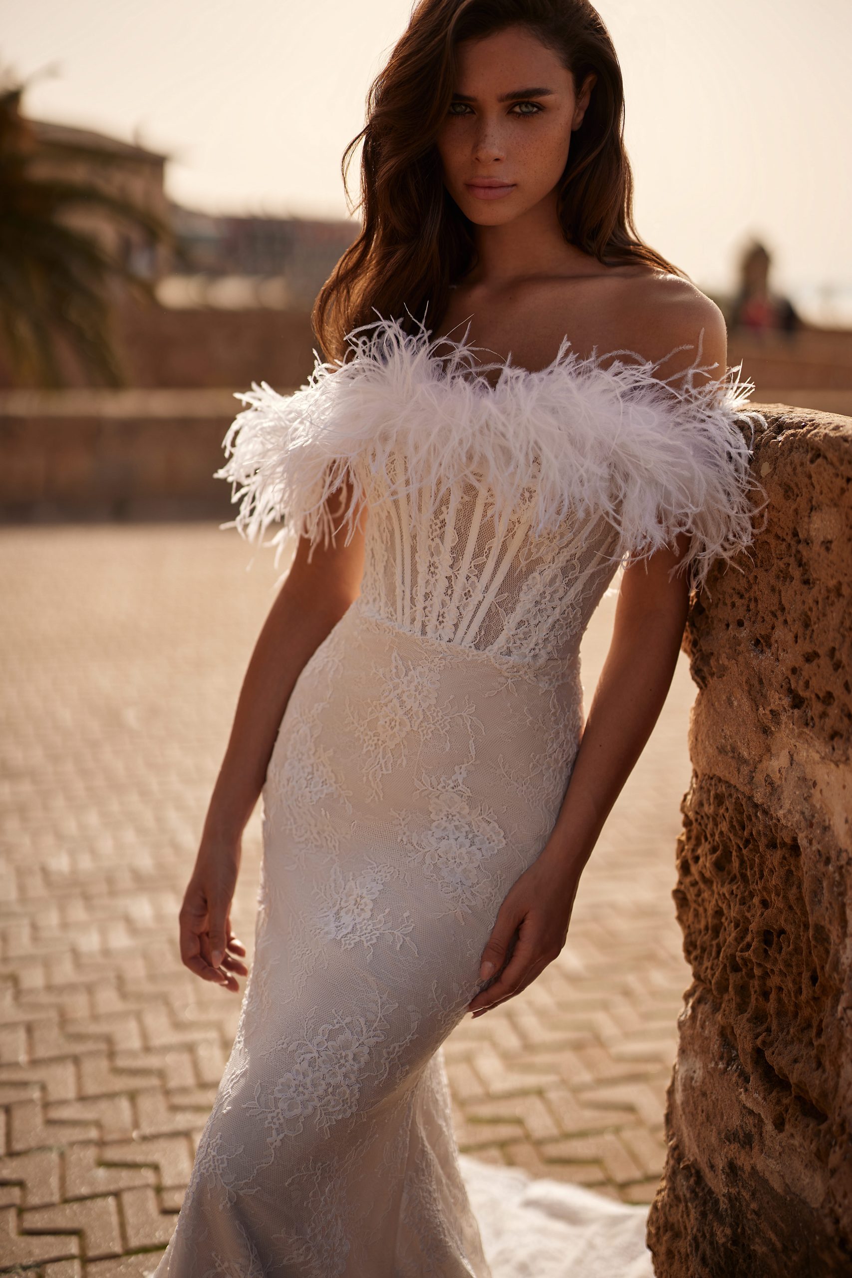 Ein elegantes Off-Shoulder-Brautkleid aus zarter Spitze mit einer sanft figurbetonten Silhouette. Das strukturierte Korsett-Oberteil betont die Taille, während der mit Federn verzierte Ausschnitt ein modernes, von der Couture inspiriertes Statement setzt. Der Rock weitet sich sanft zu einer eleganten Schleppe und formt eine anmutige Meerjungfrauen-Silhouette, die die Figur optisch verlängert. Romantisch und zugleich zeitgemäss verbindet dieses Kleid klassische Spitzendetails mit einer markanten, modisch ausdrucksstarken Textur.