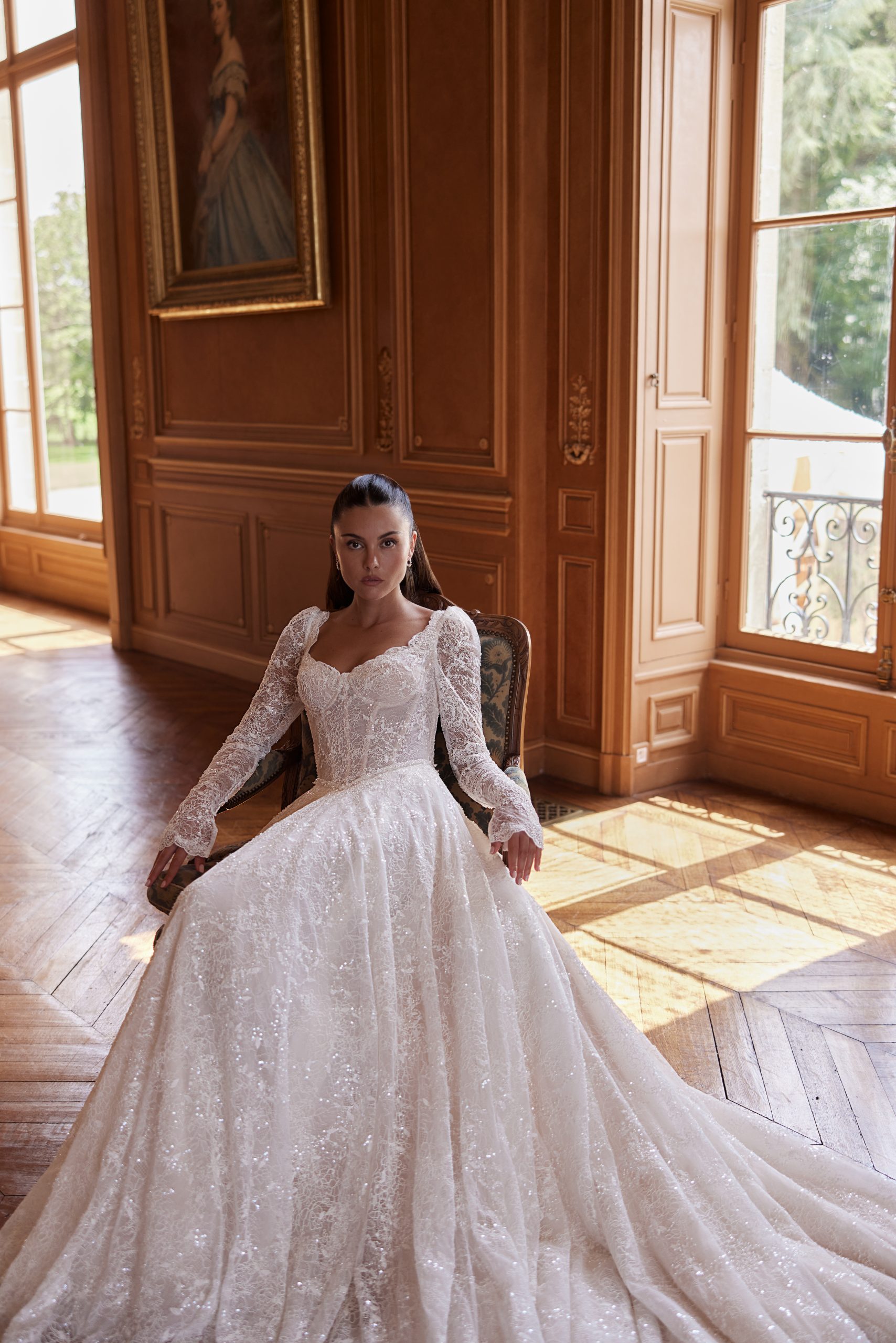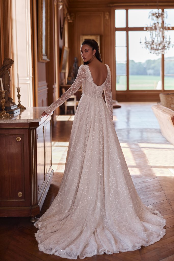 Ein raffiniertes A-Linien-Brautkleid aus zarter Allover-Spitze mit dezentem Schimmer. Das strukturierte Korsett-Oberteil verfügt über einen sanften Sweetheart-Ausschnitt mit gewellter Spitzenkante, der eine leichte Formgebung bietet und zugleich romantische Eleganz bewahrt. Lange, figurbetonte Spitzenärmel verleihen dem Kleid zeitlose Raffinesse und sorgen für eine ausgewogene, feminine Wirkung im Dekolletébereich.