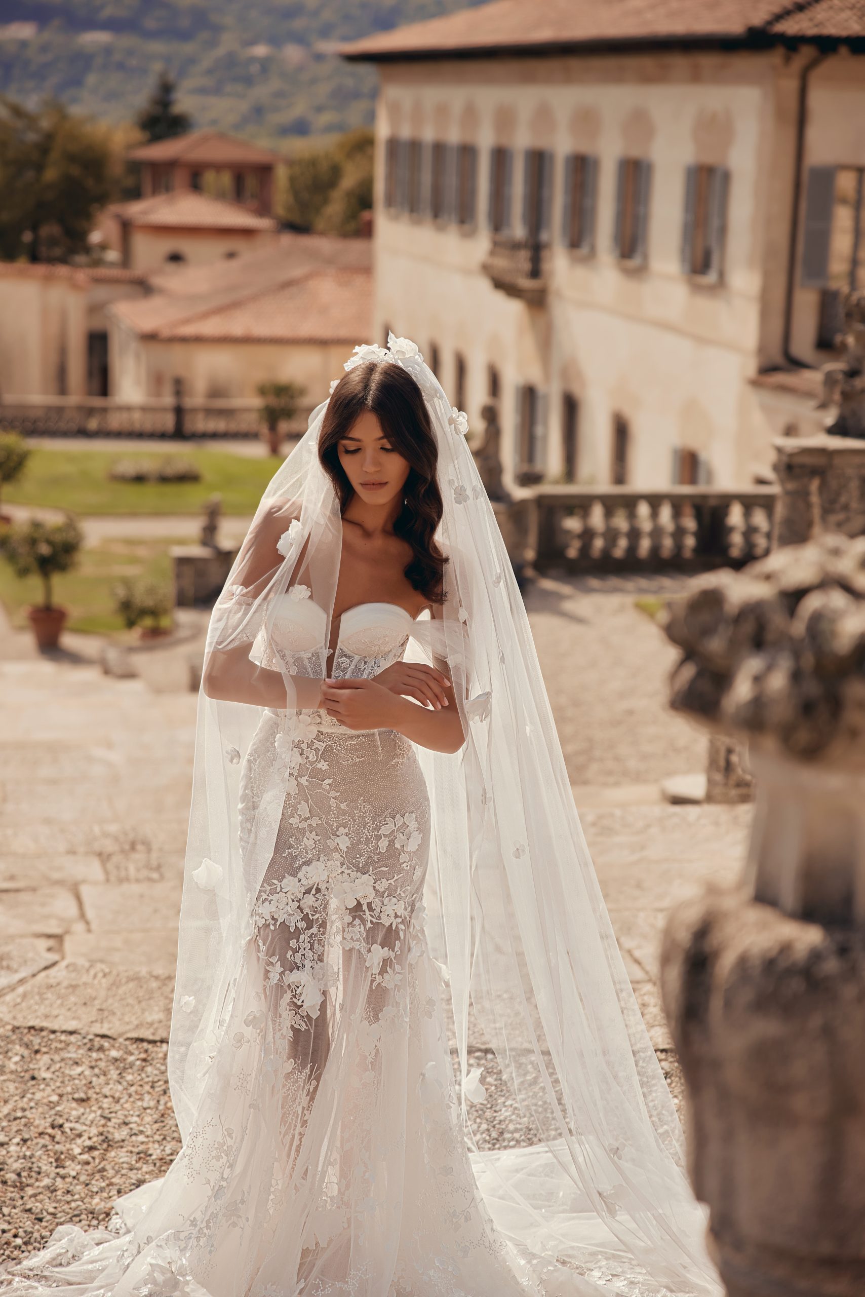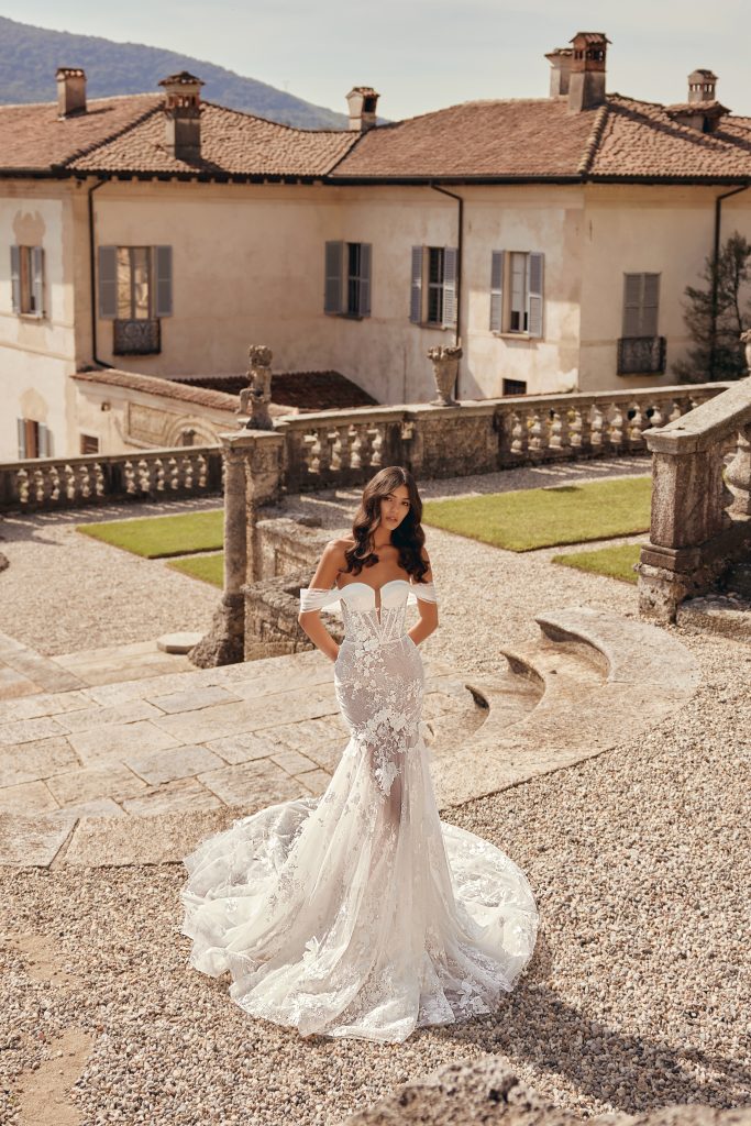Ein ausdrucksstarkes Off-Shoulder-Meerjungfrauen-Brautkleid aus zarter floraler Spitze auf weichem Tüll. Das figurbetonte Korsett betont die Taille, während die modellierte Silhouette die Figur umschmeichelt und in eine transparente, mit Spitze verzierte Schleppe übergeht. Romantisch und zugleich sinnlich verbindet dieses Design zeitlose Eleganz mit moderner Weiblichkeit und eignet sich ideal für eine Braut, die einen raffinierten, ausdrucksstarken Look sucht.