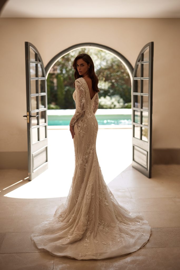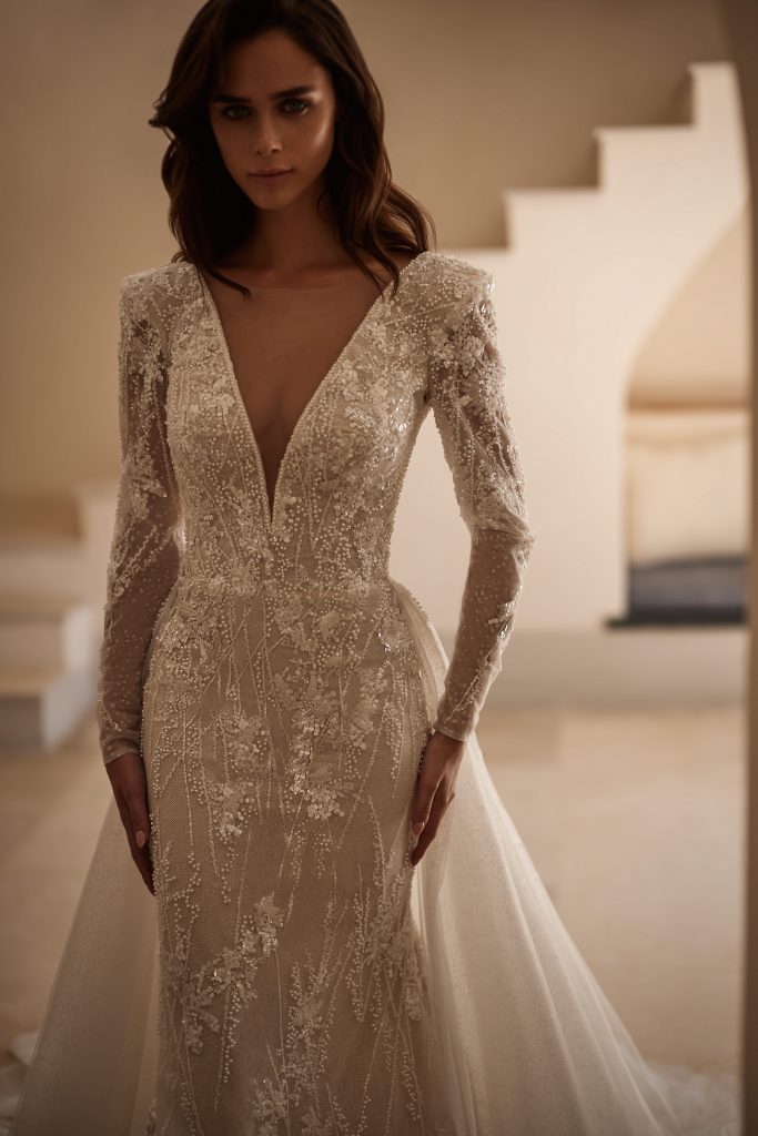 Ein ausdrucksstarkes Meerjungfrauen-Brautkleid aus aufwendig perlenbestickter Spitze, die die Figur elegant formt und betont. Der tiefe Illusions-V-Ausschnitt und die langen, transparenten Ärmel verleihen dem Design zusätzliche Eleganz und Raffinesse. Ein abnehmbarer, fliessender Tüll-Überrock schafft eine dramatische, romantische Schleppe für die Zeremonie.
