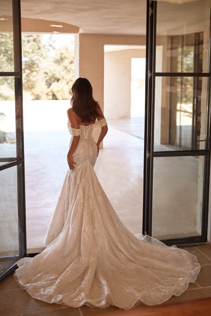 Ein faszinierendes Meerjungfrauen-Brautkleid aus schimmernder, paillettenbestickter Spitze, das die Silhouette elegant zur Geltung bringt. Das strukturierte Korsett-Oberteil mit schulterfreiem Sweetheart-Ausschnitt betont das Dekolleté, während aufwendige Perlenstickereien dem Design zusätzliche Tiefe und funkelnde Akzente verleihen. Die figurbetonte Form geht in einen sanft ausgestellten Rock mit zarter Schleppe über und schafft einen glamourösen sowie raffinierten Brautlook.