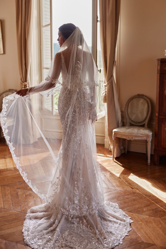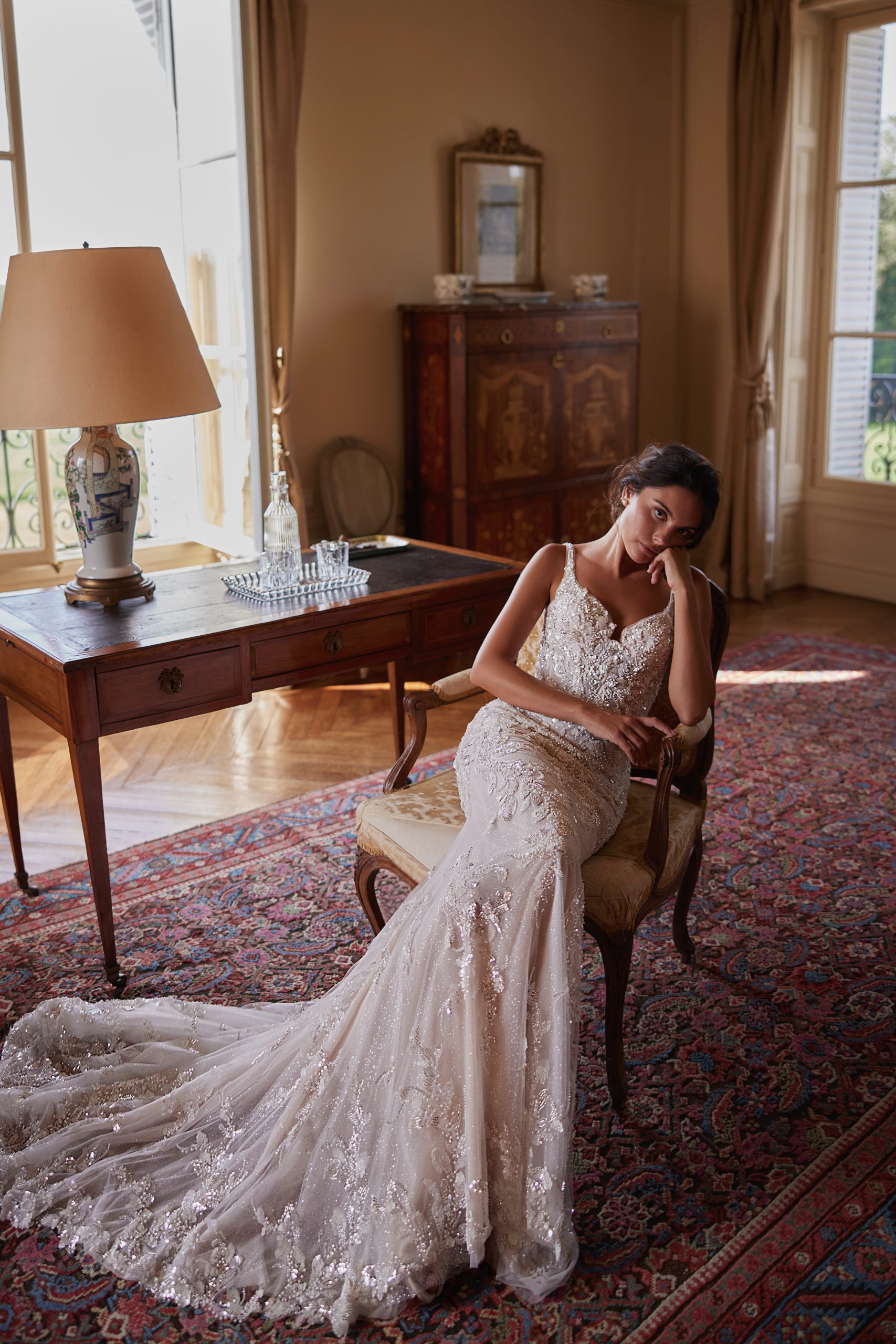 Ein raffiniertes Meerjungfrauen-Brautkleid aus aufwendig bestickter Spitzenstruktur, die die Silhouette formt und optisch verlängert. Zarte Spaghettiträger und ein sanfter V-Ausschnitt umrahmen das Dekolleté mit eleganter Weiblichkeit, während das figurbetonte Oberteil die Taille betont und die Figur bis über die Hüften hinweg modelliert.