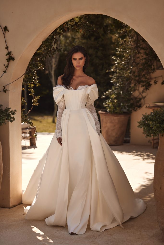Ein raffiniertes Meerjungfrauen-Brautkleid, das ein strukturiertes Spitzenkorsett mit einem eleganten Crêpe-Rock kombiniert, der die Silhouette optisch verlängert. Der schulterfreie Sweetheart-Ausschnitt und die zarten Spitzenärmel verleihen dem Kleid eine romantische und feminine Ausstrahlung.